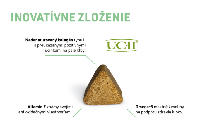 Nedenaturovaný kolagén typu II s preukázanými pozitívnymi účinkami na psie kĺby.