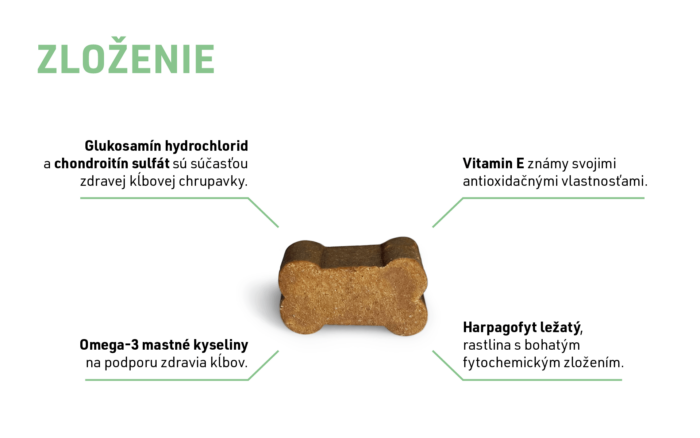 - Pivovarské kvasnice, glycerín, celulóza prášková, glucosamín HCl 11 %, chondroitín sulfát 11 %, olej z ľanových semien (zdroj omega 3), prášok z kuracích pečení, rybí olej (zdroj omega 3), pektín, sacharóza, maltrodextrín, dihydrát síranu vápenatého.